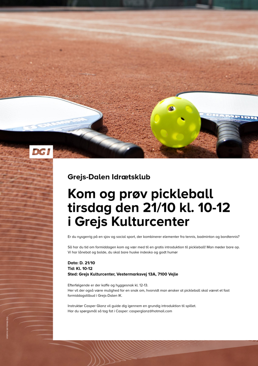 DESCRIPTION:Tirsdag den 21/10 kl. 10-12 i Grejs Kulturcenter\NEr du nysgerrig på en sjov og social sport, der kombinerer elementer fra tennis, badminton og bordtennis?\NHar du tid om formiddagen så kom og vær med til en gratis introduktion til pickleball! Man møder bare op.\NVi har lånebat og bolde, du skal bare huske indesko og godt humør\NDato: D. 21/10\NTid: Kl. 10-12\NSted: Grejs Kulturcenter, Vestermarksvej 13A, 7100 Vejle\NEfterfølgende er der kaffe og hyggesnak kl. 12-13.\NHer vil der også være mulighed for en snak om, hvorvidt man ønsker at pickleball skal været et fast\Nformiddagstilbud i Grejs-Dalen IK.\NInstruktør Casper Glanz vil guide dig igennem en grundig introduktion til spillet.\NHar du spørgsmål så tag fat i Casper: casperglanz@hotmail.com\N
