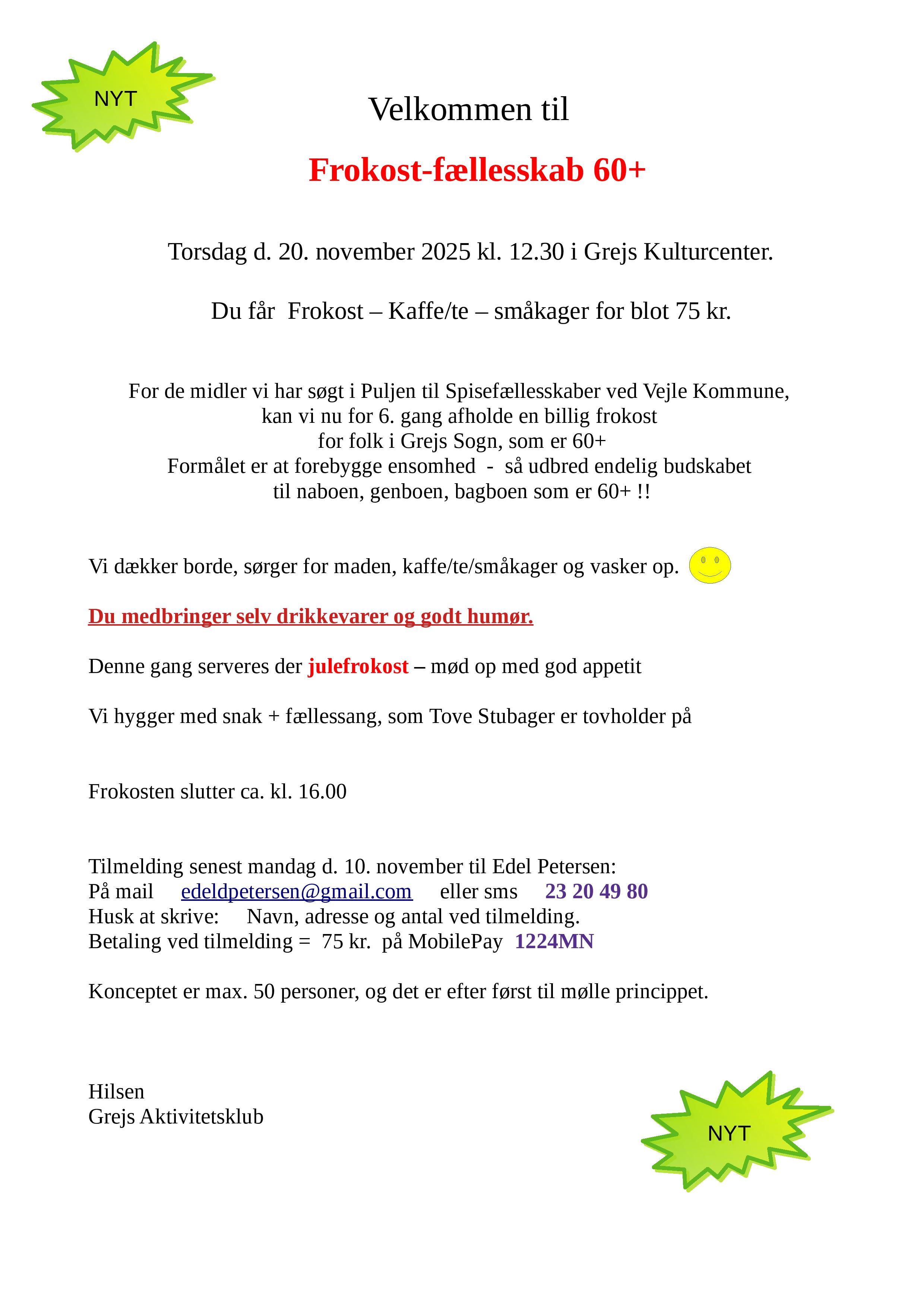 DESCRIPTION:Frokost-fællesskab 60+ i Grejs Kulturcenter for folk i Grejs sogn