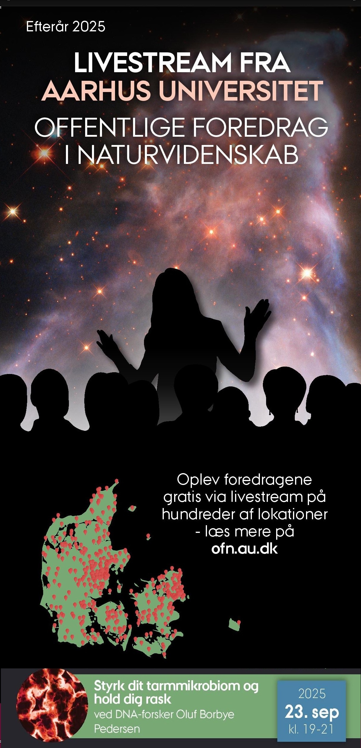 Følg spændende foredrag fra Aarhus universitet i efteråret 2025. En gruppe under Borgerforeningen har indgået aftale med Aarhus Universitet, sådan at vi kan vise foredragene 'live', denne gang på Grejs Kulturcenter Tirsdag den 23. September kl. 19 - 21., dvs. mens de vises i et auditorium på universitetet. Man kan vis SMS stille spørgsmål til forskerne undervejs. Der er gratis adgang, og kaffen og kage undervejs er også gratis. I september, oktober og november vil der være 6 foredrag; nærmere annoncering vil følge på Grejs.dk og infotavlen i NETTO.