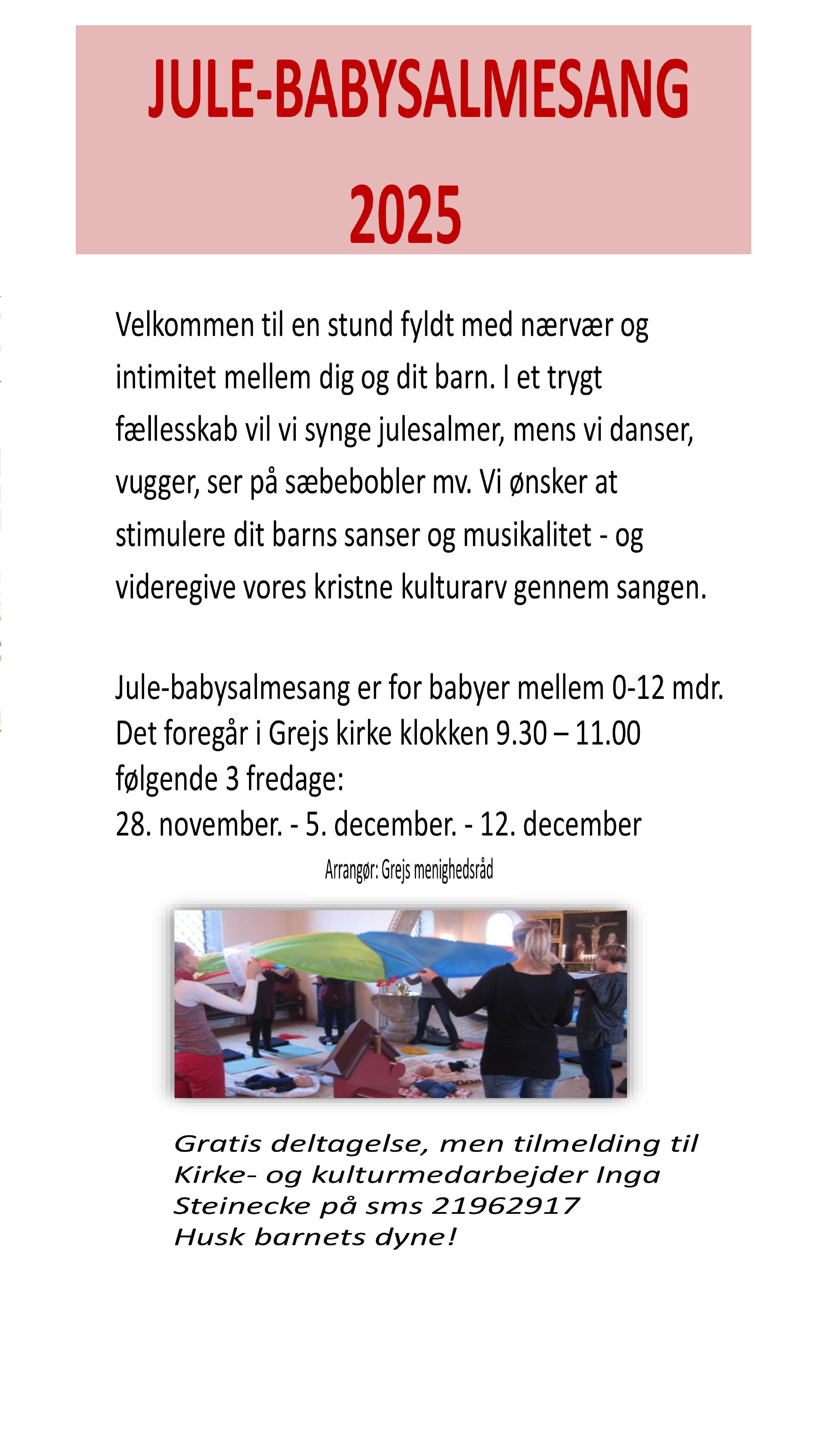 DESCRIPTION:Musikalsk legestue for de 1 - 2 årige Tag din mor eller far med til det store flotte kirkerum! Her vil vi synge sjove børnesange og smukke salmer. Vi vil bl.a. sanse, danse, bruge rekvisitter og høre bibelhistorie! Vi ønsker at udvikle og stimulere dit barns musikalitet, sprog og sanser i et trygt fællesskab, hvor nærhed og glæde er i centrum!