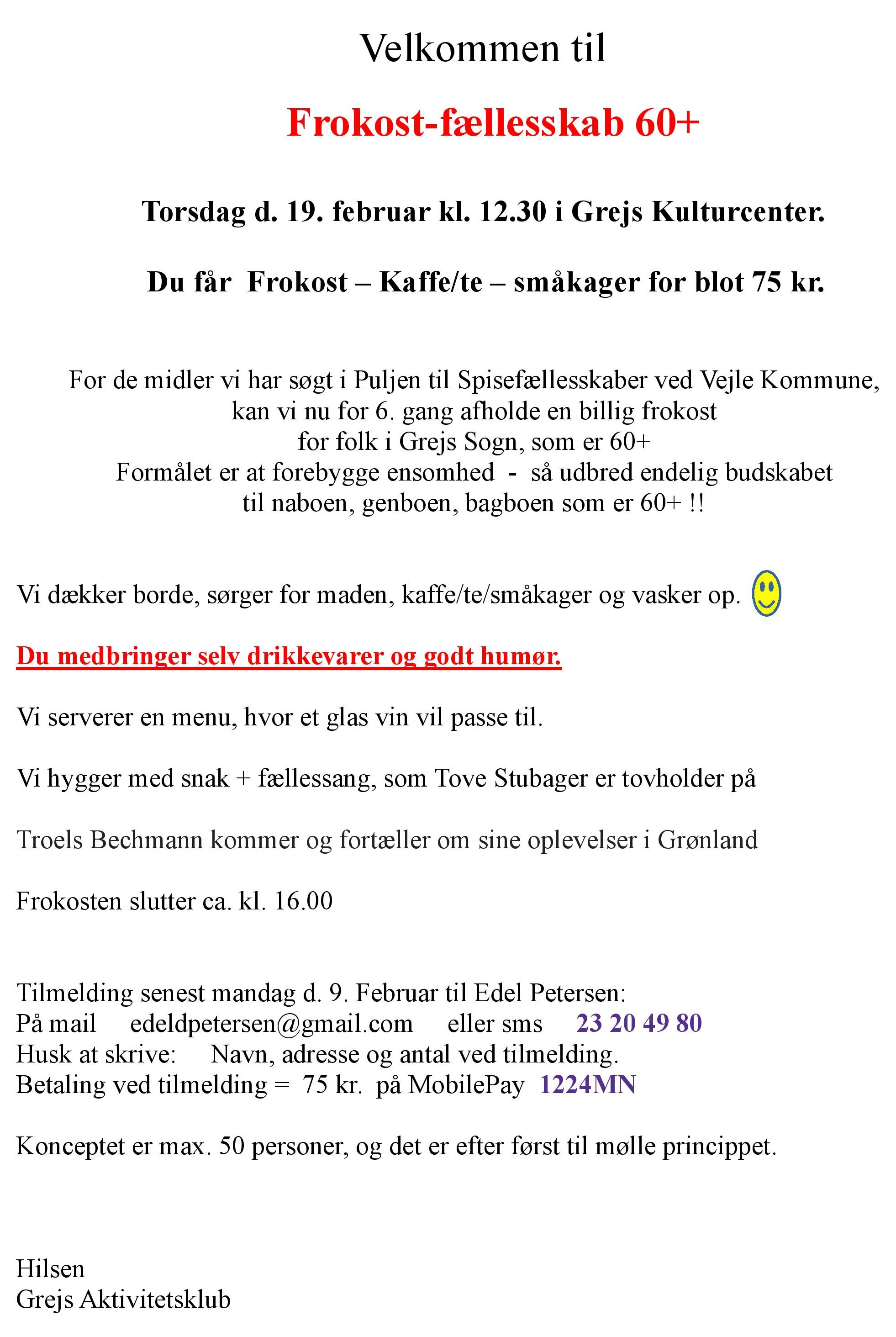 DESCRIPTION:Frokost-fællesskab 60+ i Grejs Kulturcenter for folk i Grejs sogn