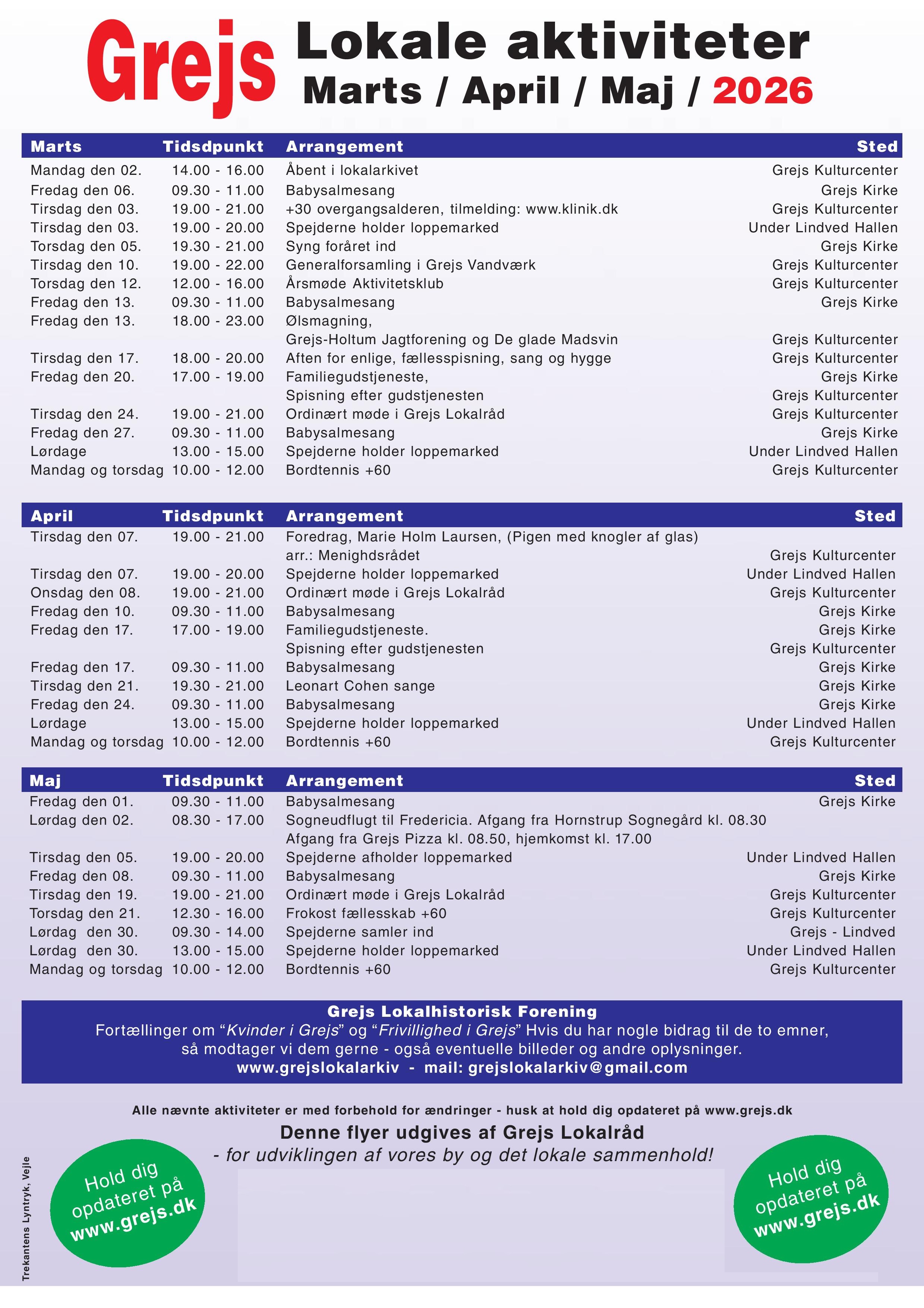 er nu omdelt i Grejs og omegn. Rettelser til kalender: Spejderne holder ikke åbent til Loppemarked lørdage i marts og april - men kun lørdag den 30. maj 2026 !!