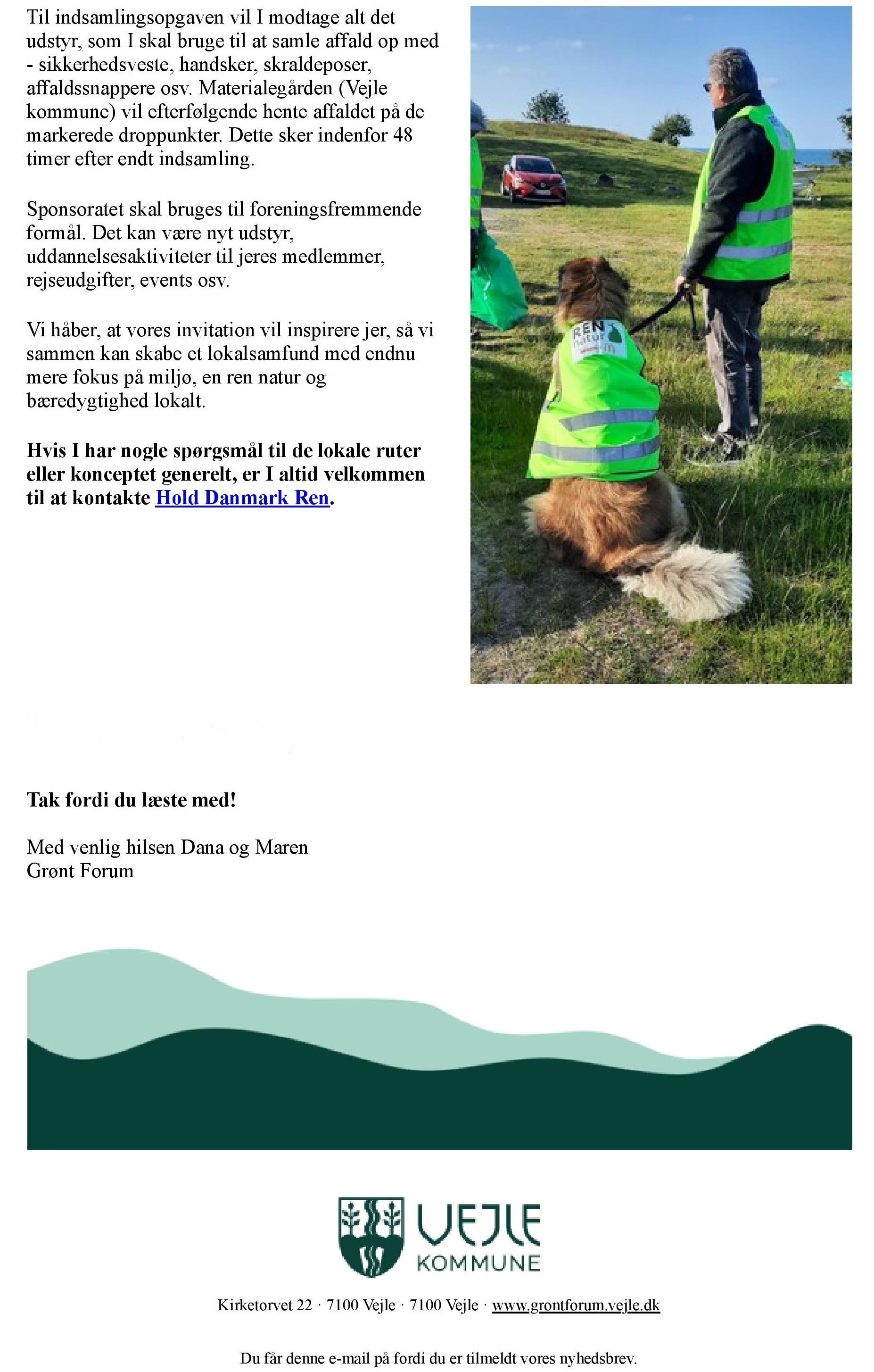 Med dette opslag fra Vejle Kommune, får I en særlig invitaiton til foreninger, der får mulighed for at indtjene sponsorpenge til klubkassen ved at hjælpe med at indsamle affald i naturen.